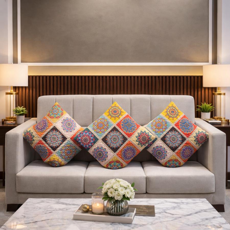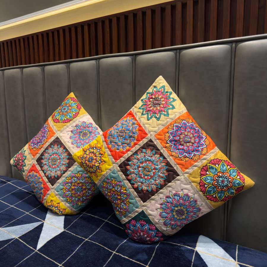 Brighten your living space with this vibrant boho-style cushion cover featuring intricate mandala patterns in a colorful patchwork design. Perfect for sofas, beds, and lounge areas, it adds warmth, creativity, and ethnic charm to any dΓ©cor.
