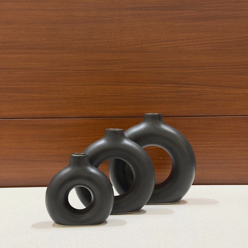Elevate your dΓ©cor with this modern ring-shaped ceramic vase set. Featuring a bold matte black finish and sculptural circular design, these vases look stunning with fresh or artificial flowers and add a contemporary touch to any space.