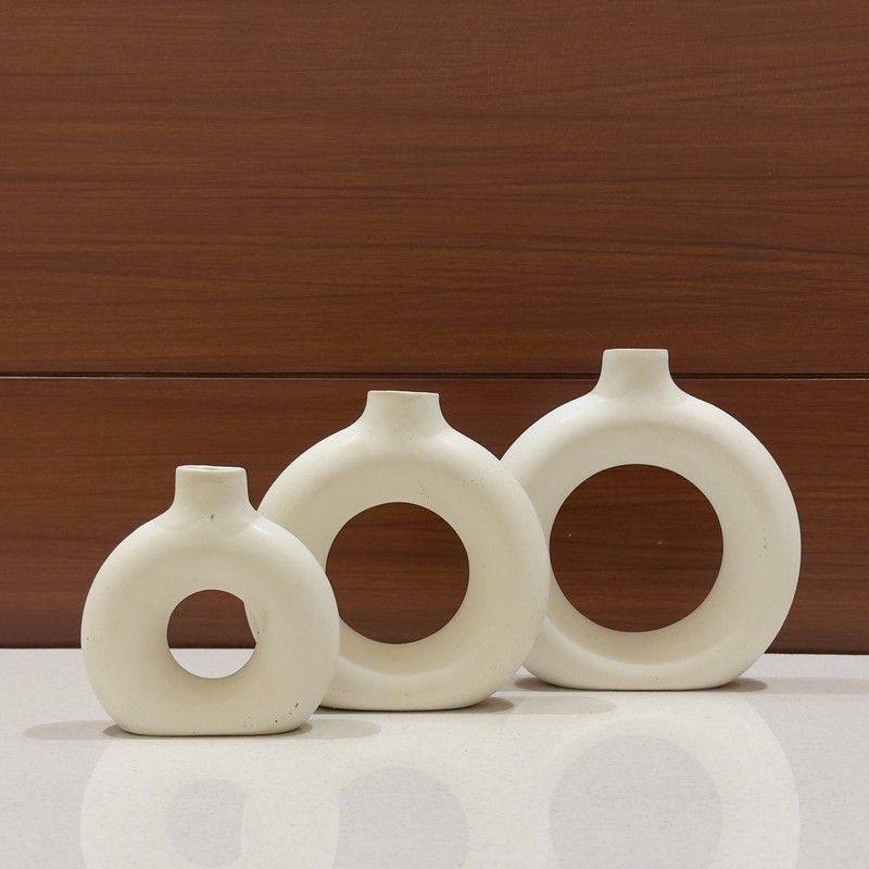 A contemporary set of three ring-shaped ceramic vases crafted to enhance modern interiors. Ideal for fresh or artificial flowers, these minimalist vases bring elegance and artistic charm to living spaces, tabletops, shelves, and offices